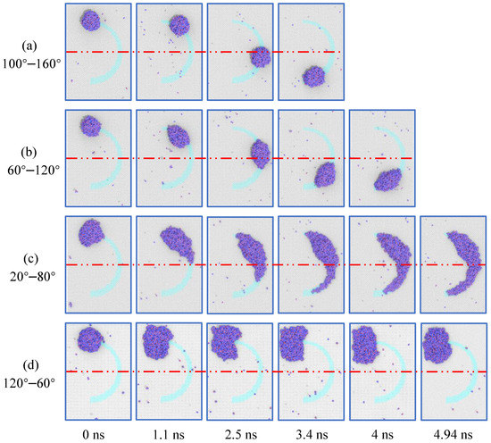 Figure 5 instantaneously illustrates droplet motion along the curve track in four groups of molecular dynamics simulations. As shown, the droplet remains quasi-ellipsoidal in the motion process in group a and group b, which is in sharp contrast to the shape of the droplet in group c. As time goes on, the droplet spreads out along the track on the hydrophilic surface and the droplet is still in the early half of the curved track. This is because when the track with stronger hydrophily is driving the droplet forward, it needs to overcome the strong pinning effect of hydrophilicity of the background on the droplet. As for case d, the droplet tends to separate from both sides of the track. The hydrophilic background surface has a larger interfacial interaction, which makes the droplets tend to spread rather than move forward, and an effective droplet driving along the curved track cannot form.