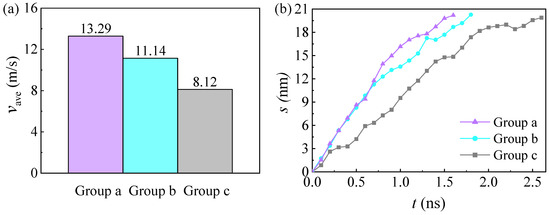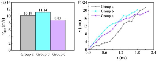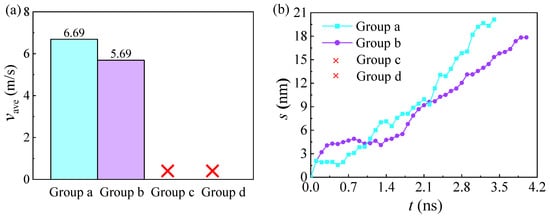 Data analysis indicates that the average motion velocity of the droplet in group a and group b separately reach 6.69 and 5.69 m/s, as shown in Figure 6a, while the droplet in group b moves much faster than that in group a, see Figure 6b. This is because the track and background in group a are both hydrophobic surfaces, which show weak adsorption for the droplet. In addition, the track is narrow in the initial section, which exerts slight influences on the actuating velocity of the droplet. After 1 ns, the motion velocity in group a exceeds that in group b. By observing the complete motion courses of the droplet over time in Figure 6b, the following result is found: the droplet does not always move forward on the curved track but also stagnates or, at times, retreats slightly. This is because the heading direction of the droplet constantly changes during motion on the curved track. Therefore, the forces applied by the surfaces on the droplet are also adjusted continuously in the motion process with varying directions, despite the forward motion along the track. Evidently, the self-actuation of the droplet can be realized on the functional surface and with a certain wettability difference, in which case the track and background are both hydrophobic and more conducive to the self-actuation of the droplet.