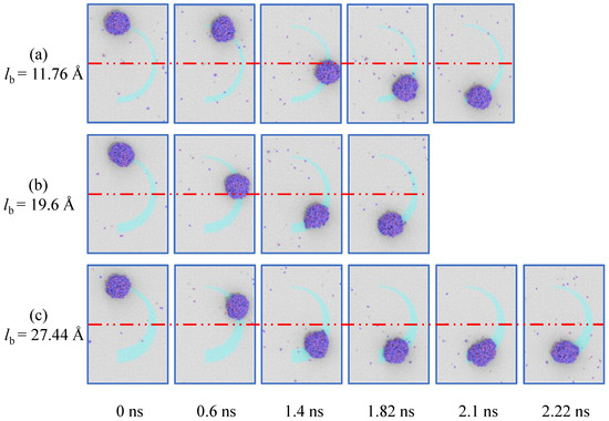 Instantaneous pictures showing the droplet motion on the surfaces of tracks with different widths. (a) The track witdh lb is 11.76 Å; (b) The track witdh lb is 19.6 Å; (c) The track witdh lb is 27.44 Å. Red center line is marked to assist in observing droplet movement.