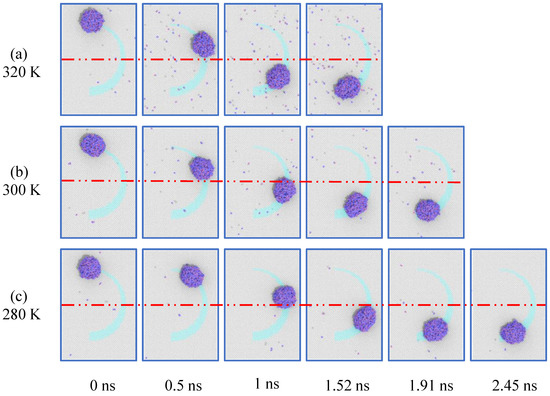 The temperature parameter was adjusted to explore the droplet motion on the surface at a temperature of 280, 300, and 320 K in the simulation system. The instantaneous pictures of the droplet motion along the curve at different temperatures are shown in Figure 9. The results show that the droplets move increasingly fast along the curve with rising temperature. The motion velocity of the droplet is 8.12, 11.14, and 13.29 m/s with increasing temperature, as shown in Figure 10a. The movement process of the droplet over time is shown in Figure 10b. The simulations imply that in the simulation system under different temperatures, the same potential energy parameter εO-Cu shows the same wettability of the droplet, that is, the contact angle between the droplet and the surface does not change due to different temperatures. Therefore, the analysis indicates that the motion velocity of the droplet changes mainly because the temperature change alters the intermolecular kinetic energy. As the temperature increases, molecular motion becomes more violent, thus increasing the interaction frequency of the droplet and surface and enabling faster motion of the droplet. In practical application, the motion velocity of the droplet can be adjusted by controlling the temperature.
