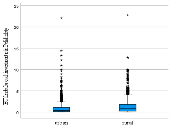Boxplots of EU funds per solar renewable energy investment under operational programmes in 2014–2020 in urban and rural areas. Explanation: * shows the value of EU funding in mln Polish zloty for each solar RE investment in urban and in rural areas.