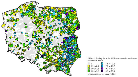 Most analysed SRE investment cumulated in eastern, north-eastern and south-eastern rural areas of Poland. Investments in solar renewable energy co-financed by EU funds were not located in many rural municipalities of western, south-western and central Poland. Most of the highest values of EU funding were in the south-eastern rural areas of the country (Figure 2).