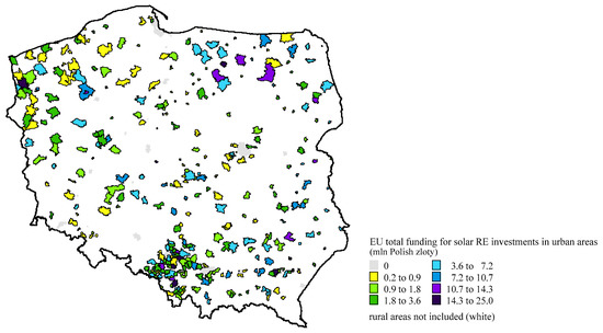 The value of EU funding invested in solar renewable energy projects in urban areas did not depend on their socio-economic characteristics, and in rural areas it depended only on four out of 14 socio-economic characteristics. Additionally, these characteristics, namely, the share of population using water from waterworks, the average number of beneficiaries of social assistance per 10,000 inhabitants in 2014–2020 and the average number of enterprises per 10,000 inhabitants in 2014–2020, explained only a small part of the change in the value of EU funds. This shows that the absorption of EU funding supporting solar RE investments does not depend on the selected socio-economic characteristics, which are the key factors determining the level of local development at the same time. In the situation where local governments are one of the two main groups of beneficiaries, this lack of relation can be explained by the financial contribution of households participating in the solar RE investments under operational programmes 2014–2020. This source of domestic funding makes solar RE investments under operational programmes 2014–2020 totally independent from communities’ budgets and thus allows local governments to carry out solar RE investments independently of communities’ priority tasks, e.g., the development of infrastructure [92].