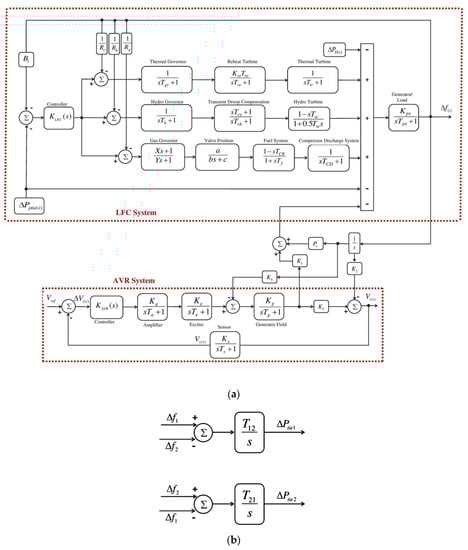 (a) Model of IPS with combined AVR-LFC. (b) Tie-ine connection for two-area.