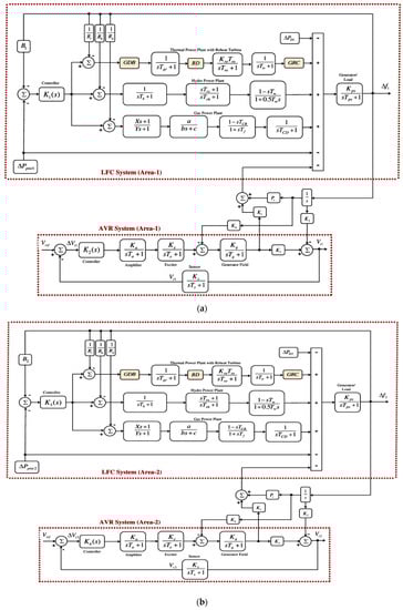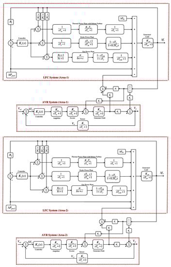 It is vital in a power system to maintain electrical power at the desired voltage and frequency. The load is always dynamic and varies over time. The difference between generation and load demand creates an imbalance between reactive and active power in the system [1]. This imbalance causes fluctuations in the voltage, frequency and tie-line power. Active power affects the frequency of the system, while reactive power depends on the system voltage. In order to maintain the desired and reliable voltage with frequency in a power system, two loops are built into the power system: a load frequency control (LFC) and an automatic voltage regulator (AVR). The AVR loop essentially reduces voltage fluctuations to meet reactive power requirements from a generator excitation mechanism, while the LFC loop reduces frequency fluctuations by modifying the active power magnitude through its governor action. Voltage and frequency controllers have gained importance with the growth in interconnected systems and have made the operation of power systems more reliable. The design of a proper control strategy is important to minimizing frequency and terminal voltage deviations as well as minimizing the variations of power flow in the tie-line [2]. Moreover, the performance of a controller solely depends upon the tuning methodology. Therefore, the control design and tuning scheme both are very important for the optimal control of an IPS. In order to acquire adequate and stable power, an effort has been made in this research to simultaneously control LFC and AVR loops using a nature-inspired, computation-based control methodology. The classical PID controller and its variants are widely used for the individual and combined control of AVR-LFC control loops due to their simpler implementation and design. For example, a HAEFA-based fuzzy PID controller was explored in a two-area multi-source IPS in the presence of different energy storage technologies, such as UCs, SMES and RFBs [3]. In ref. [4], the authors presented a PI-PD controller based on recently introduced, nature-inspired meta-heuristics including AOA, LPBO and MPSO for a multi-area IPS. A DPO-based PIDA controller was explored for a two-area multi-source IPS with two solar energy and three bioenergy sources [5]. In ref. [6], an AFA-based CPDN-FOPIDN controller was employed in a three-area IPS with nonlinearities such as GDB and GRC. Further, an HVDC link and different energy storage devices were also incorporated to improve the performance of the system. A CFOTDN-FOPDN controller designed with AFA was proposed for a two-area multi-source, nonlinear IPS [7]. An AFA-based CFPD-TID controller was suggested for a three-area IPS in the presence of GDB, GRC, RFBs and HVDC link [8]. The authors also recommended an HHO-based 2DOF-ITDF controller for a three-area multi-source, nonlinear IPS with reheat thermal, wind, solar thermal and dish-Stirling generation units [9]. In [10], the authors examined an ADRC controller based on second-order-error-driven control law in an IPS. The generation units in the IPS included solar, geothermal, wind and EVs. The HHO-tuned TIDF controller was also investigated for a three-area multi-sources nonlinear IPS [11]. APIDA controller tuned with hFPAPFA was also applied to a single-area, single-source IPS [12]. An FA-based PID controller was explored for a two-area multi-source IPS with nonlinearities such as TD, GRC and GDB [13]. In ref. [14], the authors presented a PIDD controller for a two-area, nonlinear IPS incorporating UPFC and SMES. A GWO was utilized for the tuning of a PIDD controller. The NLTA-based PID controller design was also proposed for a two-area, linear IPS [15]. For a two-area IPS with reheat and non-reheat thermal power plants as generating units, SCA-based PIDA and PI controllers were explored for LFC and AVR loops, respectively [16]. In the presence of GRC, a DE-AEFA-based PID was evaluated for a two-area IPS. An HVDC link, IPFC and RFBs were also incorporated in the power system for satisfactory improvements [17,18]. In ref. [19], the authors suggested an IPSO-based CPSS controller for a single-area, nonlinear IPS. An FA-based PID controller was investigated for a two-area multi-source IPS with non-reheat thermal- and hydro-generating units [20]. A FOPID controller was explored for a two-area, nonlinear IPS. The optimum parameters of FOPID were found using MSO [21]. The response of a two-area multi-source, nonlinear IPS incorporating IPFC, SMES, GDB and GRC was investigated with LSA-based PIDF/PIDuF controllers [22]. ZN-based PID and FLC controllers were applied to a single-area, single-source IPS [23]. In ref. [24], the authors examined a single-area IPS with a single generating unit using a hybrid NN-FTF controller. For a two-area, nonlinear IPS with non-reheat thermal and hydro units, an SA-based PID controller was also presented [25]. Moreover, relevant work on IPSs presented by different authors can be seen in [26,27,28].There is extensive research in the field of individual LFCs. Recently published work in the field of LFC can be found in [29,30,31,32,33]. The nomenclature used in this work is provided in Table 1, while the summary of the literature studies on the combined control of LFC-AVR loops is shown in Table 2.