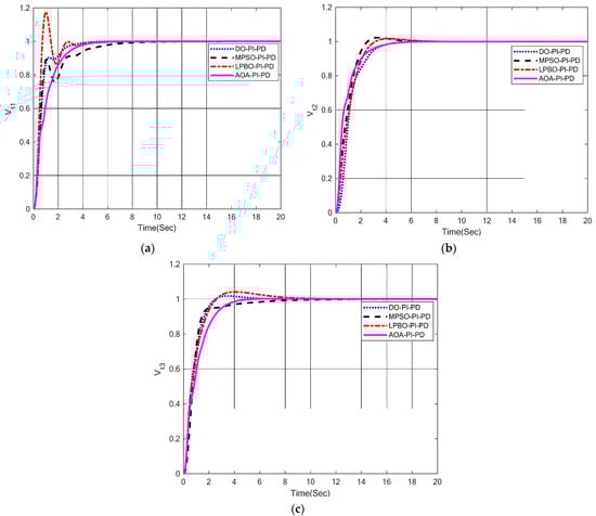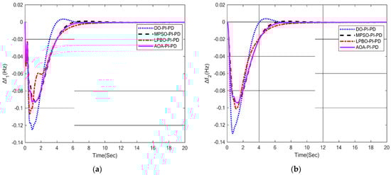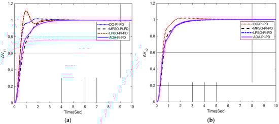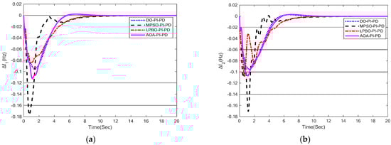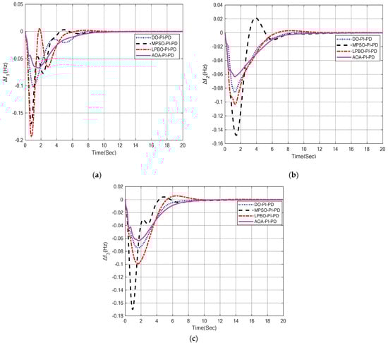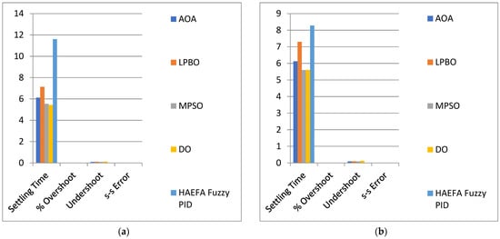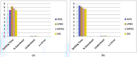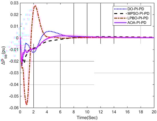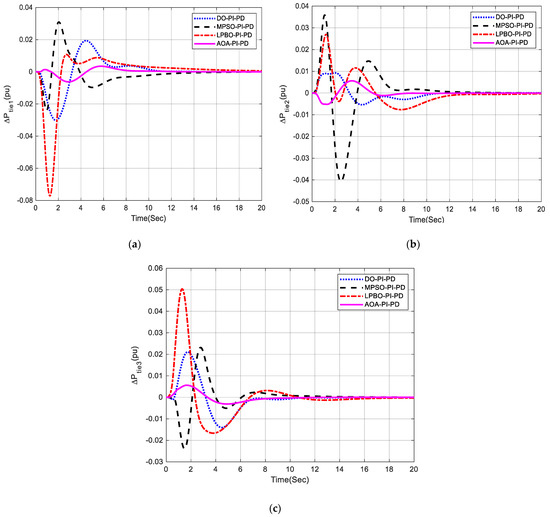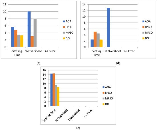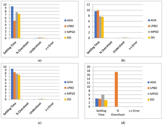 Figure 18 shows the tie-line power deviation curves, and Table 15 presents the numerical results of tie-line power deviation in a three-area, three sources/area IPS with nonlinearities using DO-, AOA-, LPBO- and MPSO-based PI-PD control techniques. The DO-based PI-PD provided the quickest settling times of 10.79 s and 10.35 s in area-1 and area-3, respectively. In area-2, the MPSO-based PI-PD provided a settling time of 11.13 s, which is a little bit lower than the settling time of the DO-based PI-PD controller, which was 11.31 s. This means the DO-based PI-PD controller yielded, relatively, a 13%, 11% and 20% better settling time response compared with the AOA-, LPBO- and MPSO-based PI-PD controllers in area-1. Further, the DO-based PI-PD controller produced, relatively, a 2% and 7% better settling time response compared with the AOA- and LPBO-based PI-PD controllers in area-2. Finally, the DO-based PI-PD controller provided, relatively, a 12%, 24% and 13% better settling time response compared with the AOA-, LPBO- and MPSO-based PI-PD controllers in area-3. Overshoots were once again minimal in each control scheme in all areas. The performance metrics of the DO-, AOA-, LPBO- and MPSO-based PI-PD control techniques in a three-area multi-source IPS with nonlinearities are graphically compared in Figure 19. It is evident that the tie-line power deviation, terminal voltage and frequency responses of the DO-based PI-PD controller are significantly better than those of the other control methods.