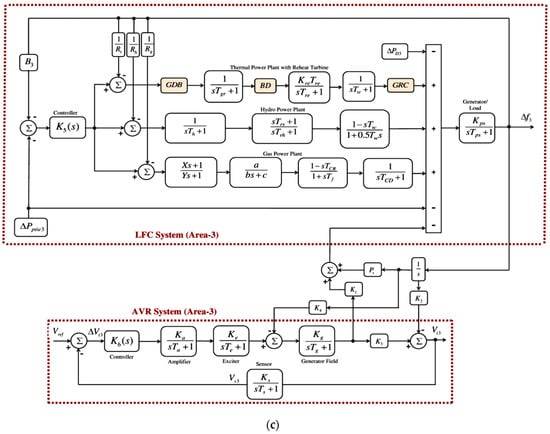 The LFC loop of ith area has a controller , ith area’s bias factor (), thermal reheat speed regulation (), hydro speed regulation (), gas speed regulation () and generator/load () with different blocks of power generation units. The thermal reheat unit consists of thermal governor (), reheat turbine () and thermal turbine (); hydro unit includes hydro governor () and transient droop compensation (), hydro turbine (); gas unit comprises gas governor (), valve position (), fuel system () and compressor discharge system (). , , and denote the load deviation, frequency deviation, deviation in terminal voltage and tie-line power deviation respectively. , , and refer to the terminal voltage, error voltage, reference voltage and sensor voltage in ith area respectively. The purpose of tie-line connection is to interconnect multiple areas in an IPS. The AVR loop of ith area consists of a controller (), amplifier (), generator (), exciter (), and sensor (). K1, K2, K3, K4 and Ps are the coefficients for mutual coupling between AVR and LFC loops. The synchronization coefficient between ith and jth area is represented by Tij. The transfer function models of the reheat thermal , gas and hydro systems provided in Equations (1)–(3) respectively [3]. The definitions of all terms used in Equations (1)–(3) are provided in Table 1.