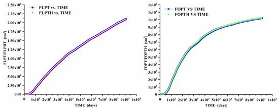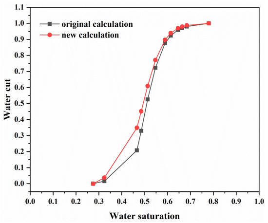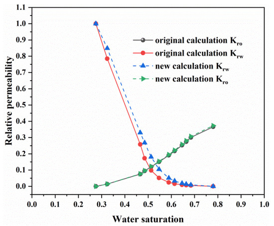 The results in Figure 2 show that the newly calculated oil–water relative permeability was slightly higher than the previous results calculated according to the Darcy flow model.