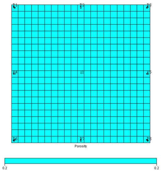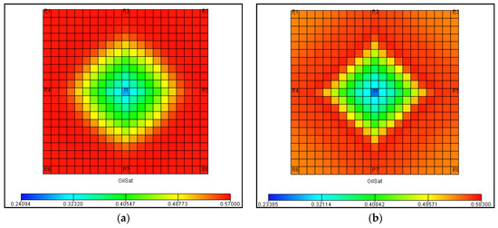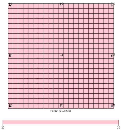 A conceptual 20 × 20 × 5 model was established, and the reverse nine-point well pattern was used for water injection development (Figure 4 and Figure 5). The total time in the simulation was 10 years, and the time step was 1 month. The Darcy flow method and the low-speed non-Darcy equivalent flow method were separately adopted for 8 months’ simulation. Judging from the comparison results, a large area of water was washed in the Darcy seepage, and the remaining oil was only concentrated near the four corners (Figure 6, Figure 7 and Figure 8). From the pressure distribution (Figure 9, Figure 10 and Figure 11), the overall pressure level was low. The affected area was smaller than the Darcy seepage, the injected water showed a fingering phenomenon, and the bottom hole pressure was much higher than that under the Darcy seepage mode. This was due to the short distance along the straight line, the small boundary layer thickness, the large bulk fluid radius, and pressure gradient. Therefore, the absolute permeability contribution value in the straight line direction was large relative to the angle well direction, and the injected water intruded faster. The water cut in the non-Darcy flow mode of well P2 in the early straight direction was lower than that of the Darcy flow model in Figure 12. From the eighth month, the water cut started to be higher than in the Darcy flow mode. This was because in the initial state, the non-Darcy seepage had a low-permeability contribution value, so the flow rate of water was slow. In the later stage, due to the influence of fingering, the injected water burst, resulting in the water cut gradually becoming higher than the water cut under the Darcy seepage method.