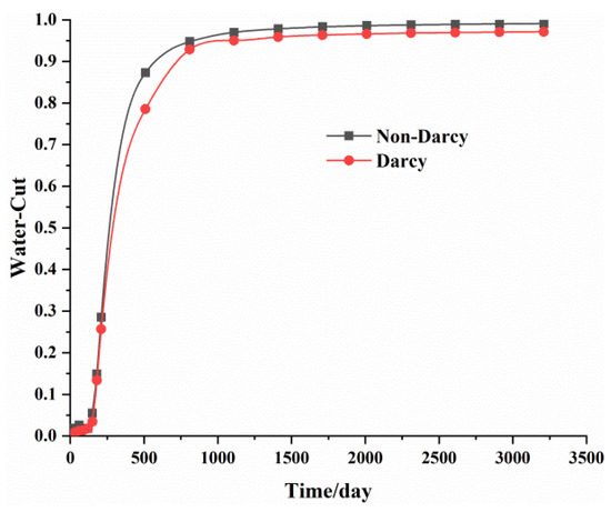 The results of water cut are shown in Figure 3, which compares the two models. The water cut calculated according to the non-Darcy flow method with low velocity was slightly higher than the result calculated according to the Darcy flow method. The conclusion was the same as the results from the previous simulation based on the established low-velocity non-Darcy equivalent seepage model. In the low-velocity non-Darcy flow model, a fingering phenomenon of injected water would easily occur, which resulted in an increase in water recovery.