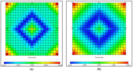 Due to the large distance of the injection-production wells, the low pressure propagation and the rapid pressure decrease at the bottom hole resulted in a large pressure difference between the grids and a large change in permeability. Because the four side wells are slightly closer to the water injection well, the pressure spreads slightly faster, and the bottom hole pressure slowly drops, resulting in a smaller pressure difference between the grids than that of the corner wells, so the permeability change range is smaller than that of the corner wells.