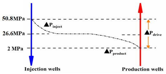 Schematic diagram of pressure changes between injection and production wells.