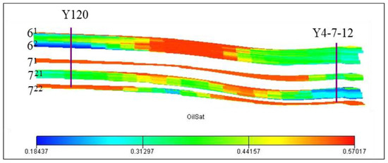 As can be seen from Figure 18, the large hierarchical difference between the remaining oil saturation in Well Y120 and the high remaining oil saturation of the 71 and 722 layers show weak submerged layers and consistency with the test results of the liquid production profile. The results of relative liquid production and water cut stratification show that the non-Darcy calculation method is more consistent with the actual monitoring results, as shown in Table 4.