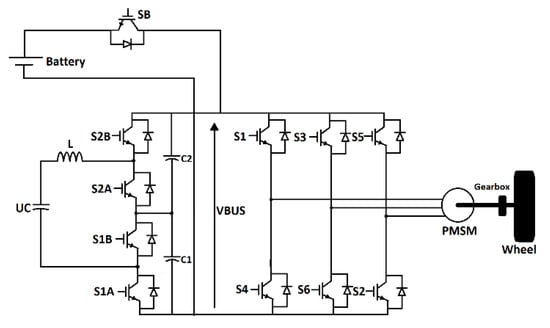 - Battiston, A.; Miliani, E.; Pierfederici, S.; Meibody-Tabar, F. Efficiency improvement of a quasi-Z-source inverter-fed permanent-magnet synchronous machine-based electric vehicle. IEEE Trans. Transp. Electrif. 2016, 2, 14–23. [Google Scholar] [CrossRef]