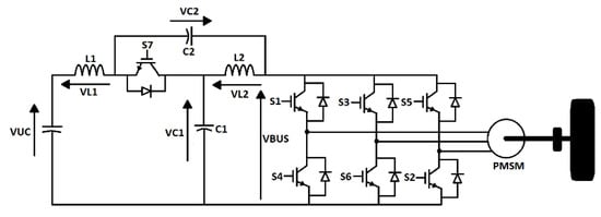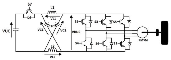 The quasi-impedance source inverter (qZSI), ref. [] was proposed to overcome the problems of ZSI. The improved Z-source network has a continuous input current, a low voltage stress on capacitors, and sharing of the input/output grounds. As shown in Figure 4, to achieve power bidirectionality, the diode is replaced by active switch S7 with a reverse diode. S7 operates during the regenerative mode and its signal is the complement of the shoot-through signal.