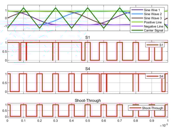 MCBC (Figure 5) uses maximal boost factor and constant shoot-through time period to eliminate low frequency surge in the impedance-source network components. The MCBC will be also implemented using third harmonic injection by replacing the modulating signals by 1/6 third harmonic injection to increase the modulation index by . It will be used in our study to conduct the comparison with the 3-level/SVPWM configuration.