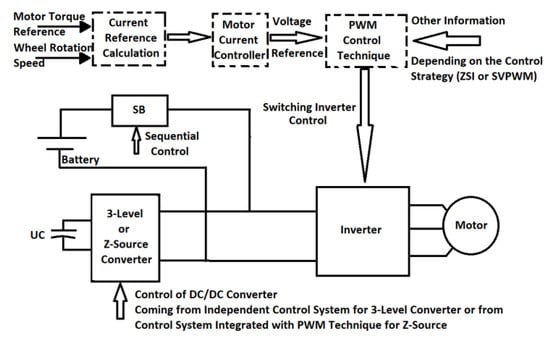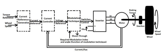 The paper layout is as follows: The Z-source is introduced in Section 2. General configurations, control structures, modulation techniques, and their relative electrical and gain equations will also be defined. Two types of control strategies will be presented (an open-loop and a closed-loop control). The 3-level converter is discussed in Section 3. The selection of IGBTs used for power loss calculations and thermal behavior of the system is also discussed in Section 2 and Section 3. Section 4 describes the thermal model and power loss computation adopted. After briefly describing the whole system model including the vehicle dynamic, the braking control, and the electric motors’ control strategies, simulation tests are performed, and the comparison analysis is provided in Section 5.