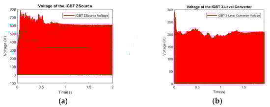 The temperatures of the DC/DC converters are presented in Figure 24. It is good to mention that the heatsink selected has a sink to air ambient thermal resistance of The thermal behavior of the two paralleled ST switches’ DC/DC Z-source converter and of the 3-level DC/DC are quite acceptable. It is known that for the 3-level DC/DC converter, two modules of two IGBTs in one package has been used. Whereas, for the single ST IGBT package, the temperature of the module could exceed the limits and lead to an improper functioning of the IGBT module.
