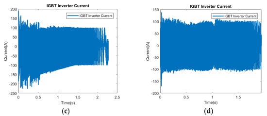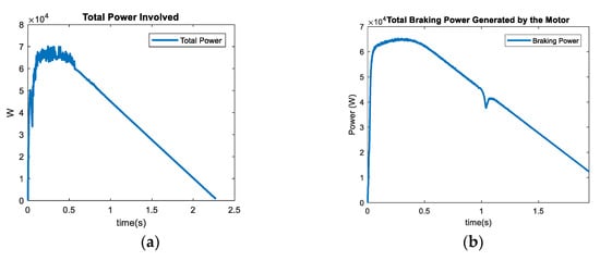 Figure 20 shows the total generated by the two 30 kW IPMSM motors and the associated braking torque for each motor for the two topologies. At the beginning of the braking, the torque ripples related to the BqZSI topology are higher than those of the SVPWM topology. At the end of the braking, the ABS system is activated ensuring a zero-torque reference. The torque control has responded accordingly. This phenomenon has not been realized on the SVPWM control due to the low cut-off speed control activation. According to the optimal control methods designed by the authors [], for a speed higher than the base speed (4457 rpm), the voltage and current limited maximum torque (VCLMT) could ensure more torque than the maximum torque per ampere control, and thus more power. The figure shows a power increase which could attain 69.5 kW for the BqZSI and 65.1 kW for the SVPWM inverter instead of a maximal power of 60 kW (for the two motors). The 4-kW difference between the two topologies ensures the boosting voltage capability of the Z-source converter.