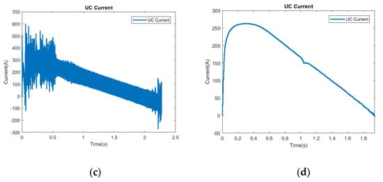Voltage and charging current of the UC for the Z-source topology (a,c) and for the 3-level/SVPWM topology (b,d).