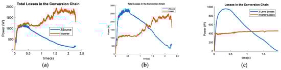 Overall losses in the powertrain conversion of (a) the two paralleled ST IGBT BqZSI topology, (b) single ST IGBT BqZSI topology, and (c) 3-level DC-DC/SVPWM.