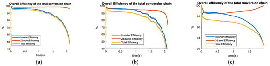 Overall efficiency of the powertrain conversion of (a) the two paralleled ST IGBT BqZSI topology, (b) single ST IGBT BqZSI topology, and (c) 3-level DC-DC/SVPWM.
