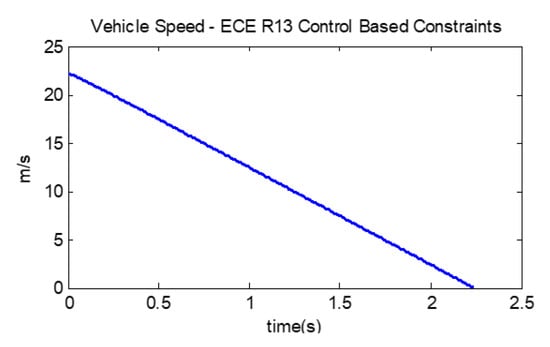 The speed trajectory of the vehicle is shown in Figure 23. The braking conditions are performed on a high friction coefficient road surface, according to the ECE R13 H regulation, with an anti-lock braking system (ABS) implemented in the braking control system.