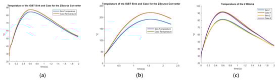 Sink and case temperatures for (a) one IGBT module in the two paralleled ST IGBT module in the BqZSI topology, (b) single ST IGBT module in the BqZSI topology, and (c) the two packages of the 2 modules forming the 3-level DC-DC converter.