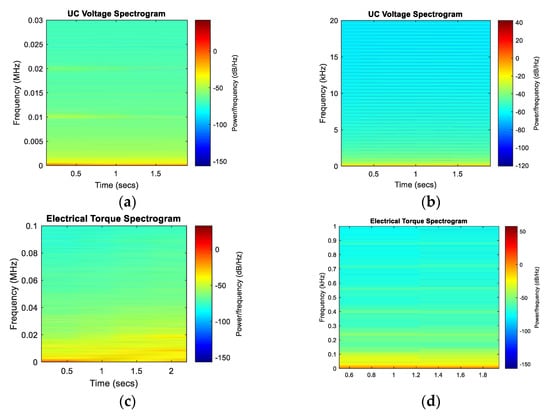 Spectrogram of the UC voltage and motor braking torque of the BqZSI topology (a,c) and for the 3-level/SVPWM topology (b,d).