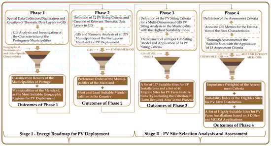 In the present paper, a decision-support framework is introduced to (a) classify and prioritize the municipalities of a country based on their suitability to host PV energy projects and (b) pinpoint and evaluate suitable technically and economically viable, as well as environmentally and socially sustainable, sites for PV installation in the most suitable municipalities of a country. The proposed decision-support framework was implemented in Portugal. It consists of four successive phases allocated in two distinctive stages (Stage I: Energy Roadmap for PV Deployment and Stage II: PV Site-Selection Analysis and Assessment). In the first stage, the most and least suitable Portuguese municipalities for PV deployment were identified by analyzing important environmental, technoeconomic, social and cultural PV siting criteria in GIS and applying the TOPSIS method. In the second stage, an integrated PV site-selection analysis and assessment were conducted in the municipality with the highest SI for PV installation in Portugal (Municipality of Mértola). The latter was performed by deploying a proper GIS siting model, employing numerous PVSC and PVAC (in total 39) and applying various MCDM methods, namely AHP, ENTROPY and TOPSIS.