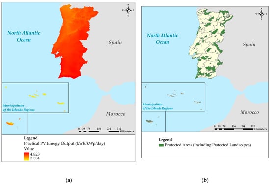 By finalizing all necessary thematic data layers in GIS, the Portuguese municipalities were analyzed according to their environmental (existence of protected areas), technoeconomic (global horizontal irradiance and practical PV energy potential), geographic (land availability) and social (distances from urban and residential areas, touristic zones and agriculture) characteristics. Then, additional criteria were included in the analysis by performing the required GIS observations and conducting an investigation analysis for the features with no spatial dimensions. Specifically, political (autonomous or non-self-governing regions) and other geographic (distance to the main electricity grid) characteristics were also examined. After finalizing the siting analysis on the national scale, the municipalities were classified into two main categories based on the insights and the results (Section 5.1) derived from the GIS analysis of the NSC presented Table 1, the required GIS observations and the investigation analysis. Next, the class of the most appropriate municipalities of the country (i.e., MoM; a total of 278 of 308 municipalities in Portugal) to host sustainable PV energy projects was selected for further PV siting analysis.