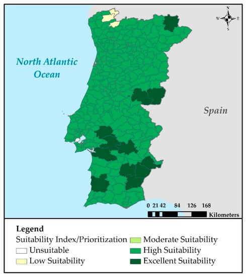 - Step 7.Determination of the preference order of the alternative solutions based on themeasure: The results of all steps are concentrated in a final overall matrix, and all alternative solutions are prioritized in a preference order based on the measure. The alternatives with the highest scores are the most preferred. In this case, the specific SI (i.e., value) was determined for all alternative solutions (MoM). Then, the MoM were prioritized on multiple spatial scales (i.e., national and regional scales) in order to determine the most and least suitable municipalities on all possible scales and contribute to a well-informed energy roadmap for PV deployment in Portugal.