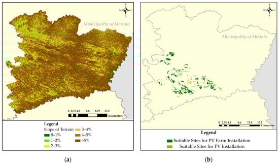 (a) Thematic map of slope of terrain (PVSC.9) and (b) suitable sites for PV and PV farm installation in the Municipality of Mértola.