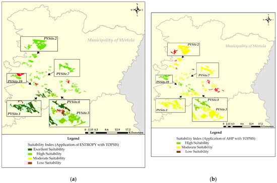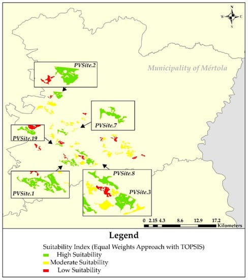 Among all examined sites, PVSite.8 and PVSite.19 (southwest of Mértola) have either excellent or high suitability, regardless the weights of the PVAC (i.e., in all possible applications) (Figure 7 and Figure 8), and PVSite.1 (southwest of Mértola), PVSite.2 (west of Mértola), PVSite.3 (southwest of Mértola) and PVSite.7 (west of Mértola) have high suitability based on the application of ENTROPY or of equal weights with TOPSIS (Figure 7a and Figure 8, respectively). These sites have high or excellent suitability because their examined characteristics make them suitable for PV siting (Table 7 and Table 8). The precise locations of these highly suitable sites for PV farm installation are highlighted in Figure 7 and Figure 8. Table 7 and Table 8 show the characteristics of the aforementioned sites of high or excellent suitability according to the selected benefit and cost PVAC, respectively. Lastly, PVSite.11 (south–central of Mértola) has low suitability, regardless the weights of the PVAC (Figure 7 and Figure 8), and PVSite.14, PVSite.15 and PVSite.31 (southwest of Mértola) have low suitability based on the application of ENTROPY or of equal weights with TOPSIS (Figure 7a and Figure 8).