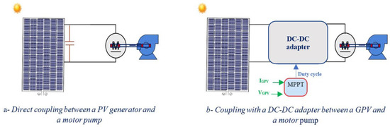 Solar pumping system installations typically require the following components: a GPV, a static power converter to improve system efficiency and reliability to optimize the amount of water pumped, and a motor pump assembly. These elements mentioned above are coupled in two ways. As shown in Figure 1a, direct coupling is the basic topology that can be made, in which a motor pump unit is directly connected to the GPV. The main reason for this option is the lack of other electronic devices to control the system, which results in a low-cost solution [23]. However, the direct influence of the coupling on the power delivered by the GPV is reflected by the intersection between the GPV and motor pump characteristics [13]. The main disadvantage of this configuration mode is that it does not allow any regulation of the voltage at the motor terminals, while the transfer of the maximum available power to the GPV is not ensured. In fact, to overcome the latter, an indirect coupling is used, in which a matching stage is inserted between the GPV and the motor pump assembly, as shown in Figure 1b. In fact, this stage acts as an interface between the two equipment and ensures the permanent transfer of maximum power supplied by the generator.