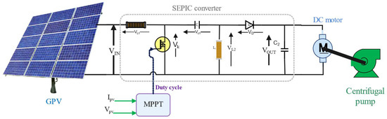 To ensure optimal operation of the GPV, it is necessary to adjust a solar water pumping system (SWPS) in such a way that the generator is forced to deliver its maximum power. Thanks to a static DC–DC converter, this function is ensured by providing an MPPT control system that acts on the converter’s duty cycle, thus ensuring optimal adaptation to the variation of the load characteristic. DC–DC converters are commonly used in renewable energy installations, including photovoltaic panels [16].They are employed to adapt the input voltage to the desired output voltage. In some cases, it is sufficient to lower or raise the output voltage; in other cases, it is better to use a controller that can lower or raise the voltage to achieve optimal energy extraction based on MPPT optimization algorithms [17].