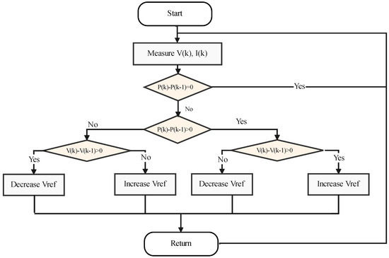 The perturb and observe (P&O) optimization technique is probably the most natural method to find the maximum power point MPP, and its principle is given by the flowchart in Figure 6. Moreover, MPP tracking is independent of temperature and/or irradiance variations. The basic principle of this optimization technique can therefore be extracted from the flowchart in Figure 6: