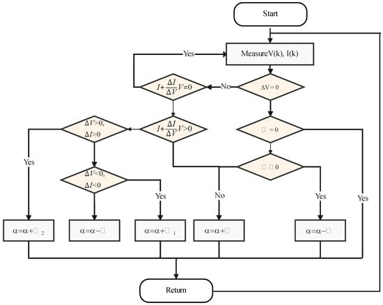 Under unstable irradiance and temperature conditions, a variation in voltage leads to a variation in the current. On the other hand, a voltage perturbation leads to a current perturbation when the photovoltaic field is subjected to a sudden change in atmospheric conditions [30]. Contrary to the classical incremental method [31], the M-INC algorithm distinguishes between these operating conditions and, thus, avoids the divergence caused by atmospheric disturbances. Indeed, the modified incremental conductance (M-INC) algorithm is supposed to act in the opposite way of the INC method when the system operates in the partial shading situation. This method is based on the power derivative being zero at MPP. It can be expressed as follows [32]: