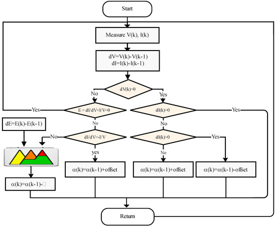 The optimization using the fuzzy logic technique can significantly reach the global power point. However, the performance of this control technique depends mainly on the human expertise. Indeed, the rules developed from the human operator’s expertise are expressed in linguistic form. Moreover, these rules determine the dynamic performance of the fuzzy controller [35]. Therefore, applying this reasoning to the incremental algorithm improves the performance of the extracted power. Figure 9 shows a flowchart of the developed hybrid FL-INC technique.