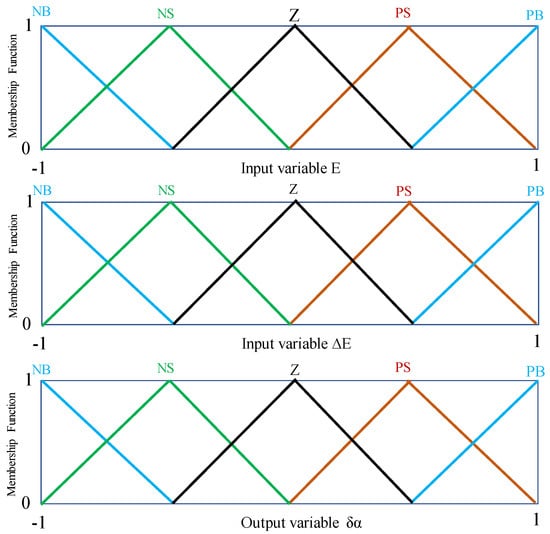 Additionally, the output of this fuzzy controller represents the change in the duty cycle (δα). Figure 10 shows the selected membership functions for E, ∆E, and δα.