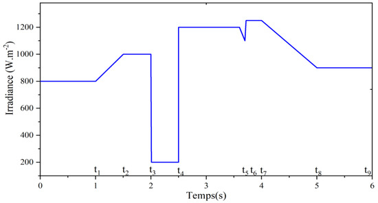 In this section, the MPPT simulation results are obtained through the PSIM simulation software. Indeed, the efficiency of MPPT by optimization techniques is evaluated under irradiation conditions similar to the real conditions. Moreover, a variable irradiance profile (from 200 to 1250 W·m−2) is chosen to test the system performance. This profile includes fast, slow, strong, and stable fluctuations, as shown in Figure 11.
