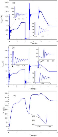 Simulation results associated with the P&O technique. (a) Instantaneous power extracted from the GPV, (b) terminal voltage at the pump motor, (c) rotation speed of the pump motor.