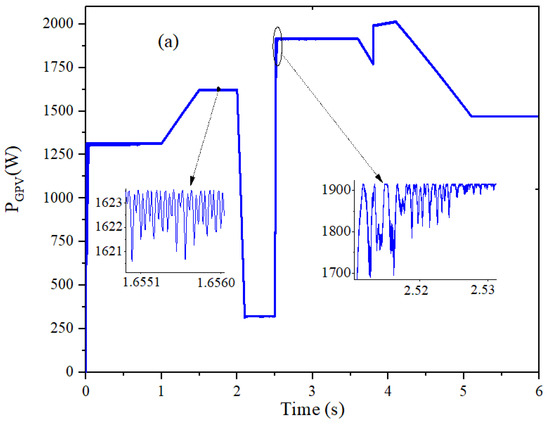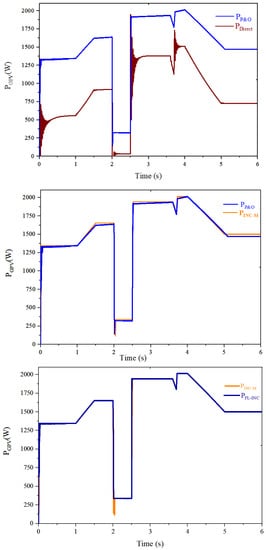 Figure 16 shows the simulation results of the instantaneous power extracted from the GPV across the four types of coupling, that is, direct coupling and coupling by an MPPT tracker. The latter is controlled by three types of algorithms: P&O, modified incremental, and hybrid FL-INC. The efficiency of the SWPS is very influenced by the weather conditions and the operating point of the system. The results in Figure 16 show that with direct coupling, the system efficiency is poor and the system operates farther from the maximum power point. The SEPIC converter with MPPT control has variable efficiency and tracking dynamics. With the P&O technique, the tracking of the power point is significantly improved over direct coupling, but the system is not able to have a better tracking speed during sudden changes in irradiance. The M-INC technique can overcome the tracking problem, but suffers from power overshoot during sudden irradiance changes compared with the hybrid technique.