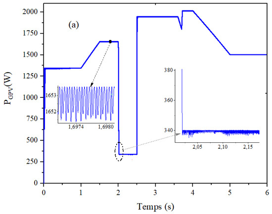Table 1 represents the electrical characteristics of the GPV proposed in this study. Indeed, it is composed of 5 PV panels (REC_330NP), and each panel can generate a peak power of 330 W peak in standard conditions. These panels are connected in series, which allows for generating a voltage of (VMPP) = 173 V and delivering a total peak power of 1650 W peak in standard conditions.