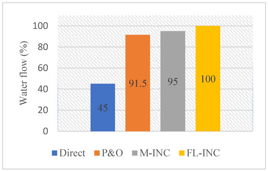 To show the influence of the power point tracking techniques on the solar water pumping flow rate, the histogram in Figure 17 presents a comparative study of the flow rate for each technique used. In fact, the flow rate in this simulation is calculated from a rotational speed that varies over the entire range of the simulation. According to Equation (3), the calculated flow rate is directly in proportion to the speed motor in the simulation. From the results, the hybrid technique has a better pumping rate than the others, that is, 55% rate compared with direct coupling, 8.5% compared with the P&O technique, and 5% rate compared with M-INC. Finally, the hybrid technique based on fuzzy logic for the artificial intelligence and the incremental technique has effectively improved the performance of SWPS.