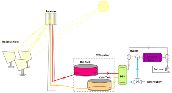 Figure 1 presents a general scheme for the CSPth Hybrid-CT system. The figure shows the plant configuration and the major components of the system: heliostat field, tower, receiver, TES system, steam-generation system (SGS), and fuel-based boiler. Auxiliary components of the system are not considered in the analysis; therefore, the LCOH results are not weighted by the energy parasitics, which usually accounts for about 10% of the electricity output in power generating systems [40].