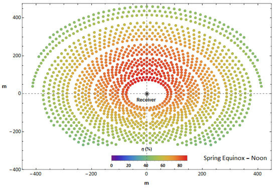 The heliostat field reflects the solar irradiation to the receiver device; as the irradiation is absorbed, the receiver’s temperature increases, this allows the receiver to transfer thermal energy to a fluid. The common heat transfer fluid is molten salt [41]. After being heated, the molten salt is sent to the hot-tank for further dispatching to a steam generation system. The fuel-based boiler operates if there is not enough solar energy to fulfill the heat demand.