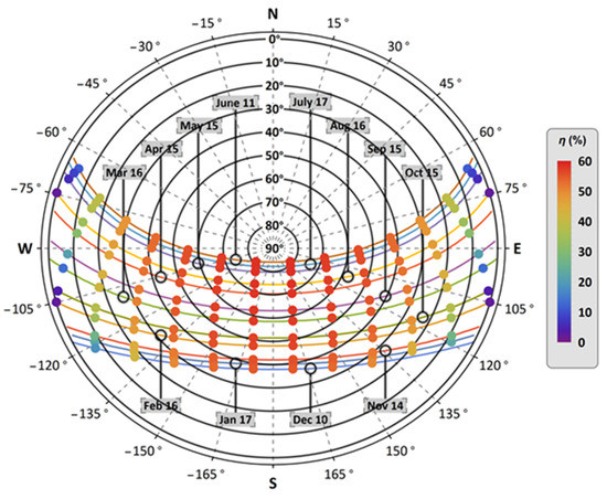 - For every hour of the year between the sunrise and the sunset, the efficiency value was taken from the nearest sun’s position that was evaluated in step 1.