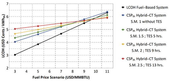 As shown in Figure 12, the marginal abatement costs of the CSPth Hybrid-CT systems are significantly high at low fuel price scenarios. A CO2 price of this magnitude compromises the competitiveness of energy consumers [76]; however, if a CO2 price is not considered, the LCOH of these systems is greater than the LCOH of fuel-based systems. In this sense, a reasonable CO2 price should be accompanied by a CAPEX reduction and low costs of capital in order to encourage the deployment of CSPth Hybrid-CT systems as a measure to reduce CO2 emissions.