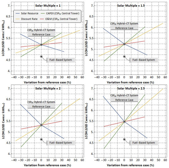 Regarding the LCOH of CSPth Hybrid-CT systems, the variables with more influence are the capital expenditure, followed by the solar resource, the discount rate, and the O&M costs. The effect that these variables have on the LCOH is extended with solar multiples bigger than 1. In this sense, the study suggests that the capital expenditure and the discount rate are key variables because they create opportunities for cost reductions, especially for large solar multiples, where the heliostat field and the TES system represent a large percentage of the capital expenditure.
